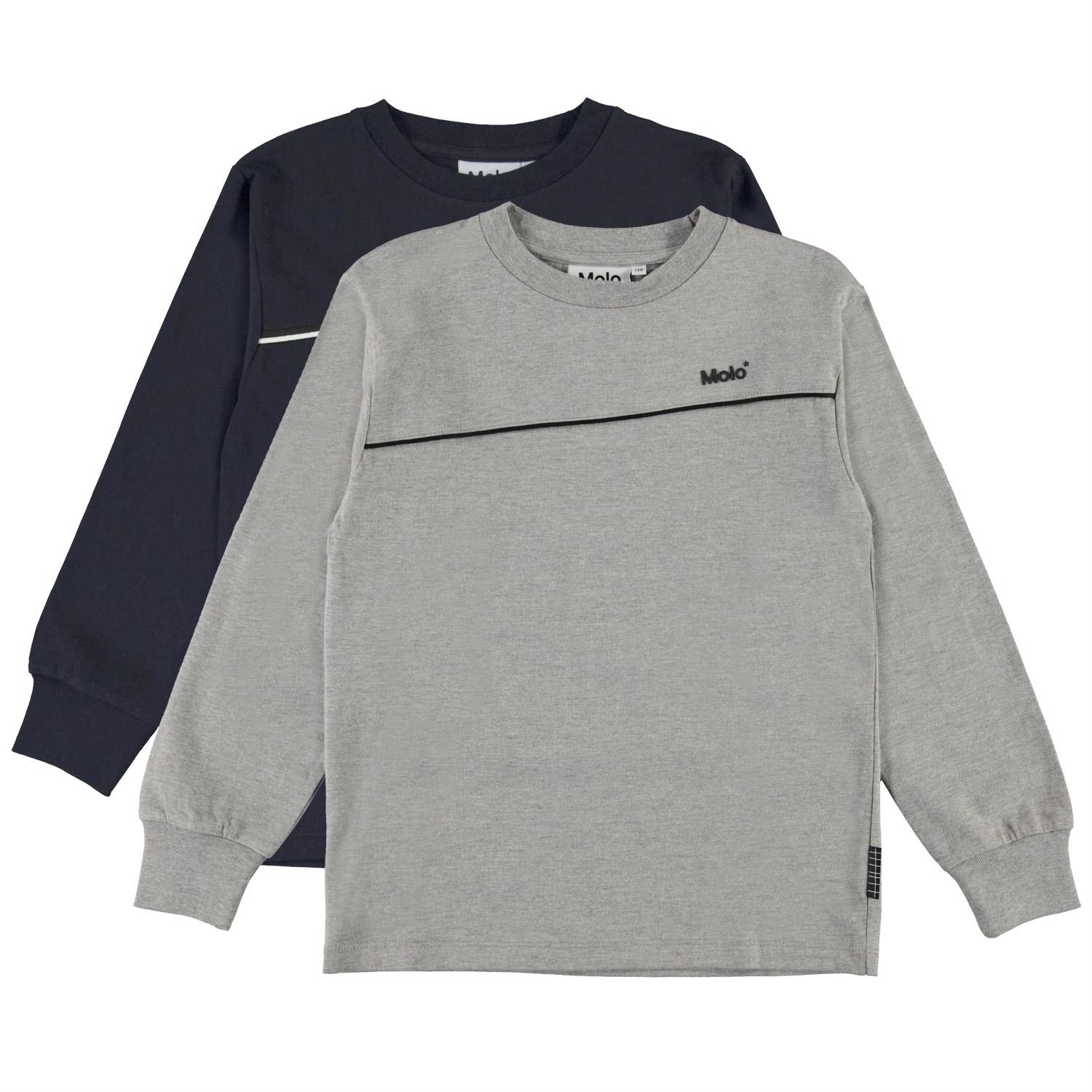 Rasmono ist Molos neues unverzichtbares Basis Langarm-T-Shirt mit langen Ärmeln. Hier im 2er Pack in Blau und Grau. Die Langarm-T-Shirts haben einen Halsausschnitt sowie ein Logo und einen asymmetrischen Streifen auf der Vorderseite.