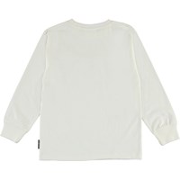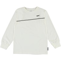 Rasmono ist Molos neue unentbehrliche Basic-Langarmbluse. Die Bluse ist weiß und hat einen runden Halsausschnitt sowie ein Logo und einen asymmetrischen Streifen auf der Vorderseite.