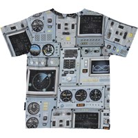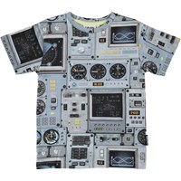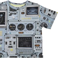 Rasmus ist ein blaues T-Shirt mit einem Allover-Print des Cockpits eines Raumschiffs.