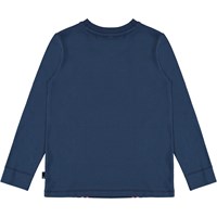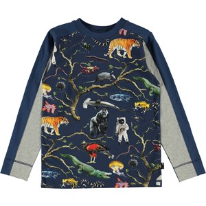 Entdecke den Aufdruck "Baum des Lebens" hier auf der Raso-Bluse. Die Bluse ist blau mit zweifarbigen langen Ärmeln in Blau und Grau.