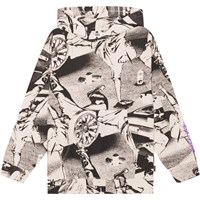 Ratata ist ein ungefärbter Hoodie mit schwarzem Allover-Print aus 100% Öko-Baumwolle. Der Druck ist ein zweifarbiger abstrakter Druck, der Breakdancer und Autos auf der Straße zeigt. Auf einem Ärmel befindet sich ein lila Platzierungsdruck mit dem Text „On Fire“. Ratata hat lange Ärmel, eine Kapuze, breite Rippbündchen an Ärmeln und Hüfte, eine Kängurutasche vorne und eine normale Passform.