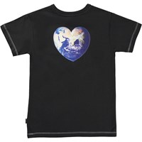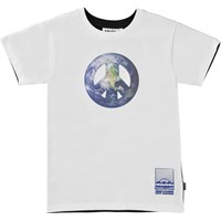 T-Shirt aus 100% Öko-Baumwolle mit weißer Vorderseite und schwarzer Rückseite. Sowohl auf der Vorder- als auch auf der Rückseite befindet sich ein aufgedruckter Globus in Form eines Friedenszeichens und eines Herzens. Das T-Shirt hat einen Rundhalsausschnitt mit Rippbündchen und eine normale Passform.