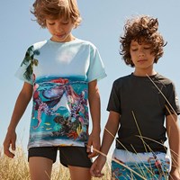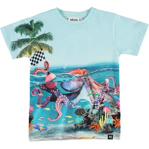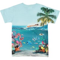 Ein fröhlicher Tintenfisch im Wasser voll von bunten Fischen und ein Schnellboot auf der Rückseite des T-Shirts. Das T-Shirt ist aus 100% Baumwolle.