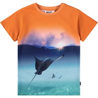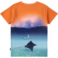 Oranges T-Shirt aus Bio-Baumwolle mit kurzen Ärmeln und geripptem Halsausschnitt. Das T-Shirt hat eine lockere Passform und einen Druck von Meerestieren.
