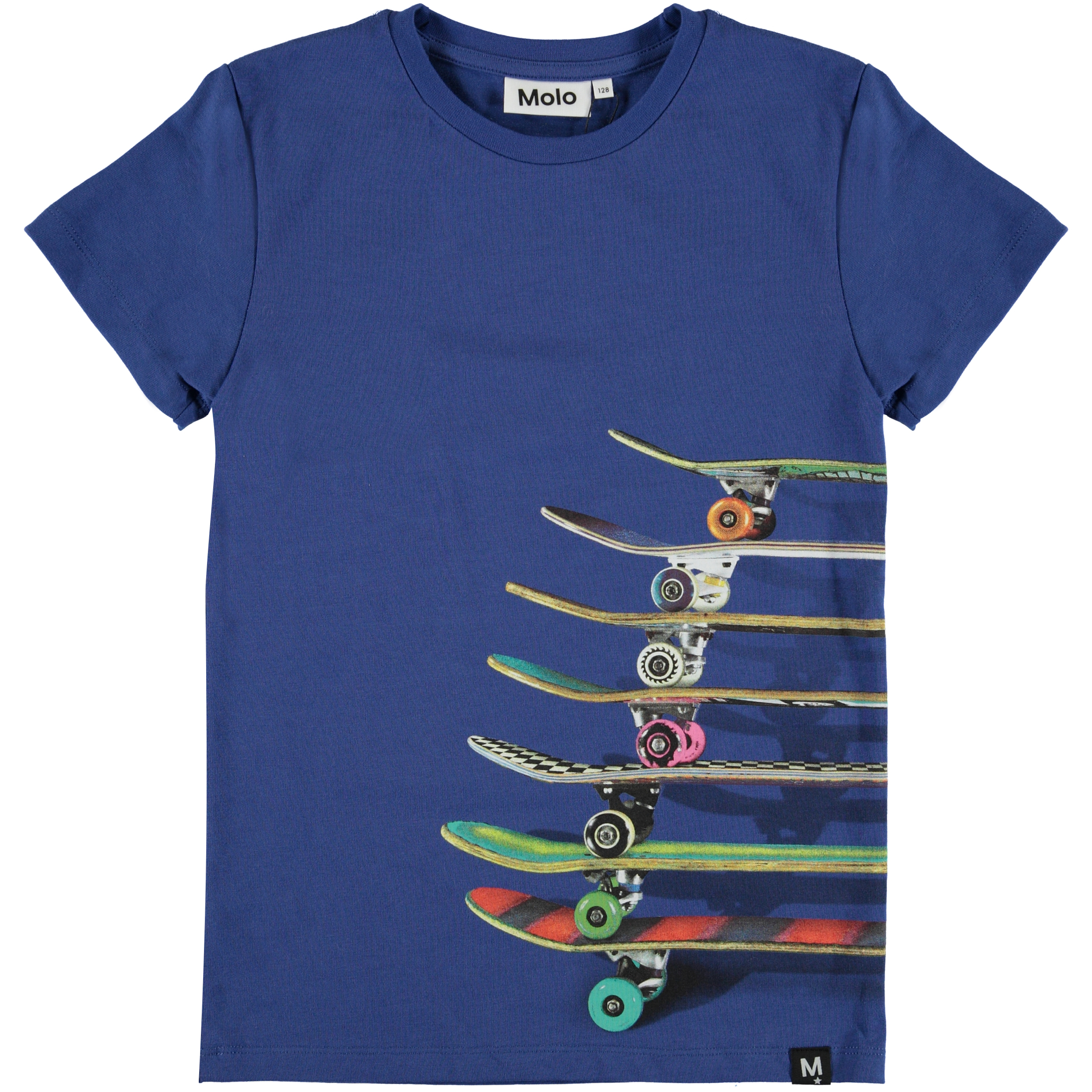 Die farbenfrohen Skateboards sind hier auf dem blauen T-Shirt Raven schön gestapelt. Raven besteht aus 100% Baumwolle und hat kurze Ärmel.