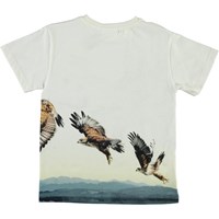 Raverno ist ein weißes T-Shirt mit einem Aufdruck großer Adler auf der Vorderseite. Das T-Shirt hat einen runden Halsausschnitt.