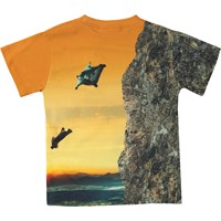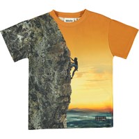 Raveno ist ein orangefarbenes T-Shirt mit dem Aufdruck eines Bergsteigers am Rand einer Klippe.