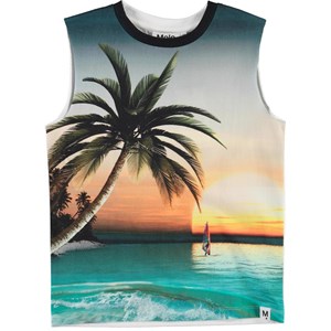 Ray ist ein weites Tanktop mit Print, das eine echte Surfer-Atmosphäre vermittelt, mit Strand, Palmen und Sonnenuntergang. Auf der Rückseite des Tanktops steht der Text "Off Shore". Das Tanktop ist aus 100% Baumwolle.