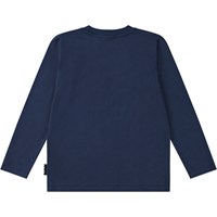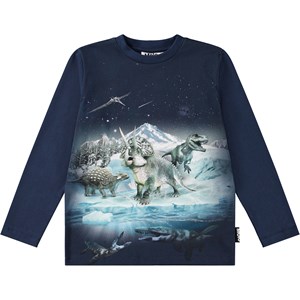 Dunkelblaue Bluse aus Öko-Baumwolle mit langen Ärmeln, Rundhalsausschnitt, geripptem Abschluss am Hals und regulärer Passform. Sie verfügt über einen platzierten Druck auf der Vorderseite, auf dem alle Dino-Freunde im Schnee am kalten Wasser versammelt sind. Wer wird wohl den ersten Schneeball werfen?