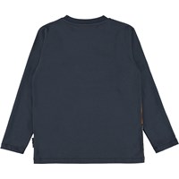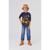 Reif ist ein langärmliges dunkelblaues T-Shirt mit dem Aufdruck eines großen Dinosauriers auf der Vorderseite.