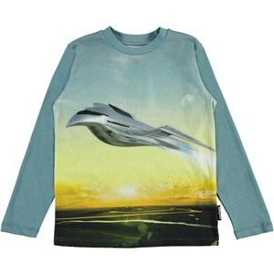 Reif ist eine langärmeliger blaue Pullover mit Aufdrucken Flugzeuge der Zukunft auf der Vorderseite.