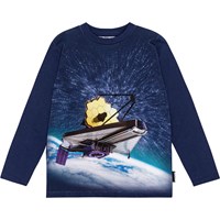 Dunkelblaue Bluse aus Öko-Baumwolle mit langen Ärmeln, Rundhalsausschnitt, geripptem Abschluss am Hals und regulärer Passform. Sie zeigt einen Druck auf der Vorderseite, der den Moment darstellt, in dem ein Fußball ins Netz saust und du ein Tor erzielst!