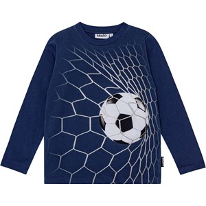 Dunkelblaue Bluse aus Öko-Baumwolle mit langen Ärmeln, Rundhalsausschnitt, geripptem Abschluss am Hals und regulärer Passform. Sie zeigt einen Druck auf der Vorderseite, der den Moment darstellt, in dem ein Fußball ins Netz saust und du ein Tor erzielst!