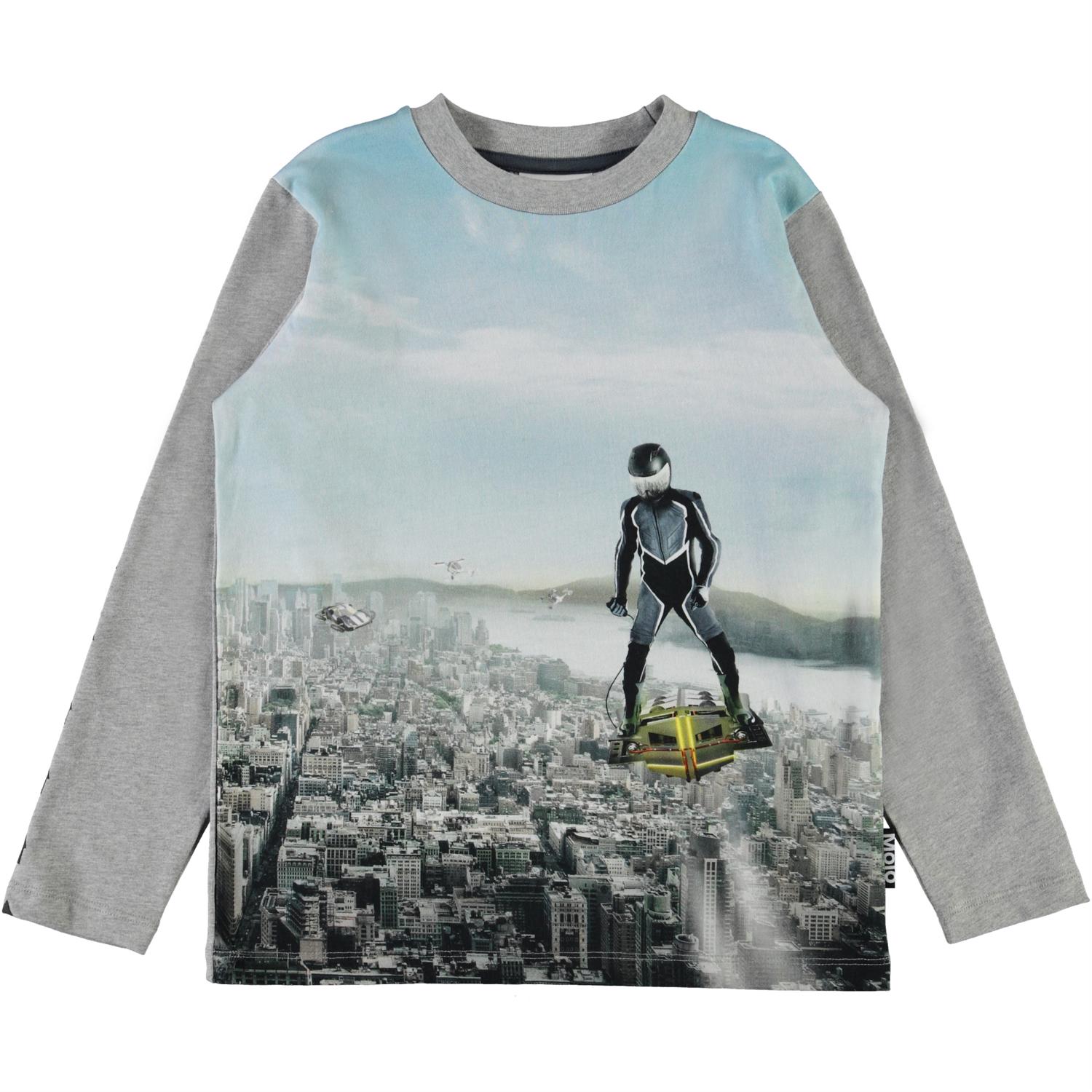 Reif ist eine grauer Pullover mit Druck von der Zukunft, in dem ein Mann mit fliegenden Autos im Hintergrund über der Stadt schwebt. Ecocert Greenlife, certifikationsnr. 197496.