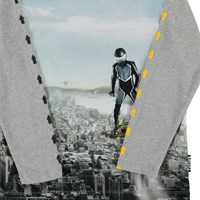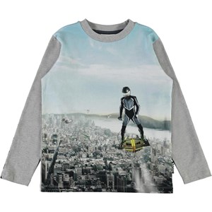 Reif ist eine grauer Pullover mit Druck von der Zukunft, in dem ein Mann mit fliegenden Autos im Hintergrund über der Stadt schwebt.  Ecocert Greenlife, certifikationsnr. 197496.