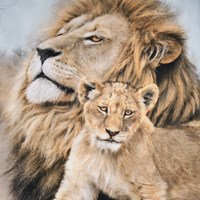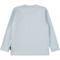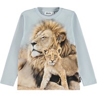 Hellblaues Langarmshirt aus weicher Öko-Baumwolle mit langen Ärmeln und einem gerippten Ausschnitt. Das Langarmshirt hat eine lockere Passform mit einem Frontdruck einer Löwenfamilie.