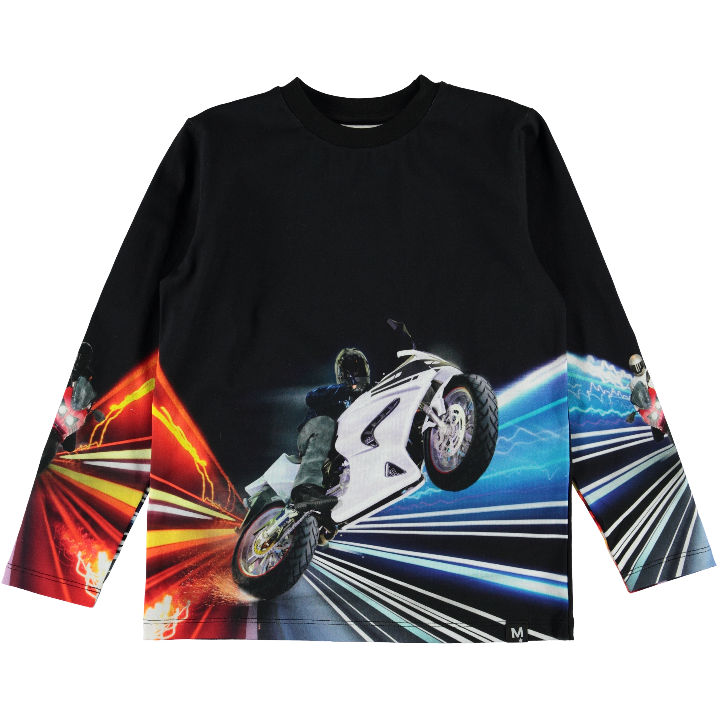 Die Bluse Reif hat den Aufdruck 'MC Rider'. Der Druck ist ein 3D-Druck, der auf den Ärmeln vorne und hinten fortgesetzt wird. Die Bluse ist aus schwarzer Baumwolle.