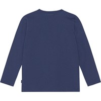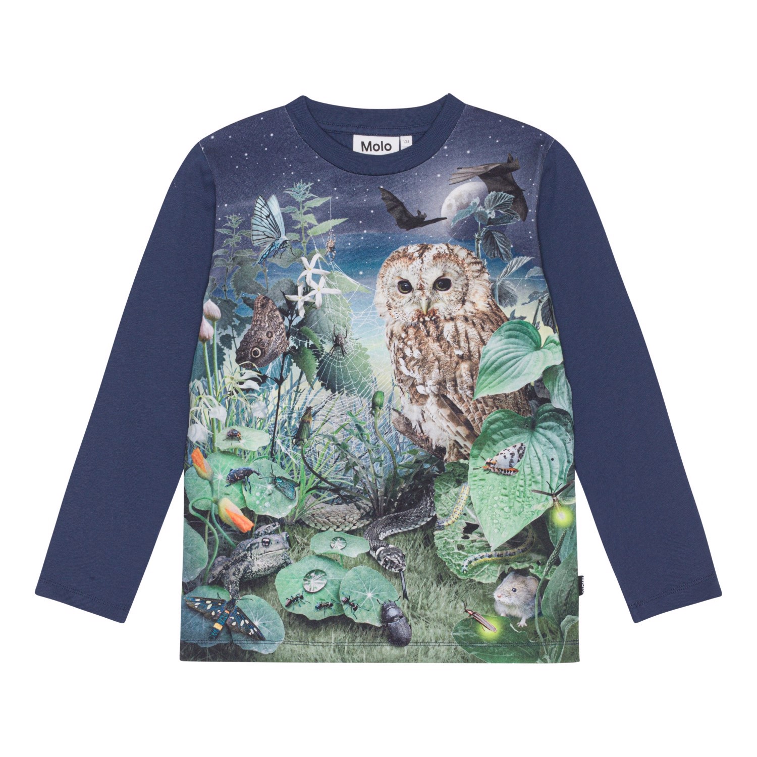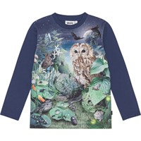 Dunkelblaues Langarm-T-Shirt aus Öko-Baumwolljersey. Das Shirt hat einen Rundhalsausschnitt, eine normale Passform mit Bewegungsfreiheit. Auf dem Frontprint des Shirts darf man in eine dunkle Nacht blicken, hier trifft man sowohl auf Eulen, Schlangen, Frösche, Insekten und viele andere Tiere, die bei Einbruch der Dunkelheit herauskommen.