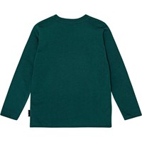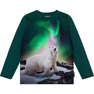 Grüne Bluse aus Öko-Baumwolle mit langen Ärmeln, Rundhalsausschnitt und geripptem Saum. Die Bluse hat eine normale Passform und einen Druck auf der Vorderseite, der den majestätischen Eisbären zeigt, der unter einem Abendhimmel mit Nordlichtern steht. Der Schnee unter dem Eisbären ist an einigen Stellen geschmolzen und erinnert uns daran, auf unseren wunderschönen Planeten und alle Lebewesen hier aufzupassen.