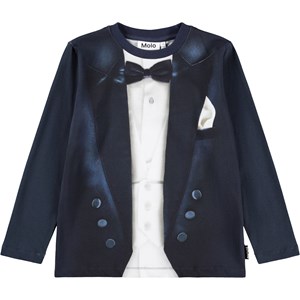 Dunkelblaues Langarmshirt aus weicher Öko-Baumwolle mit langen Ärmeln und einem gerippten Ausschnitt. Das Langarmshirt hat eine lockere Passform mit einem Illusionsdruck eines Smokings.