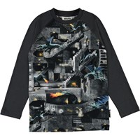 Remington ist ein langärmliges T-Shirt mit grauen Raglanärmeln und Druck von Drachen in einem Computerspiel.