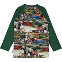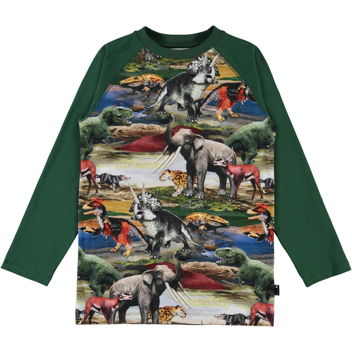 Remington ist ein grüner Raglan-Pullover mit langen Ärmeln. Hier ist der Pullover mit einem Aufruck von der Welt und Tieren aus der Vergangenheit in schönen, grünen und roten Farben. Ecocert Greenlife, certifikationsnr. 197496.