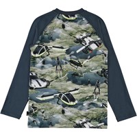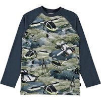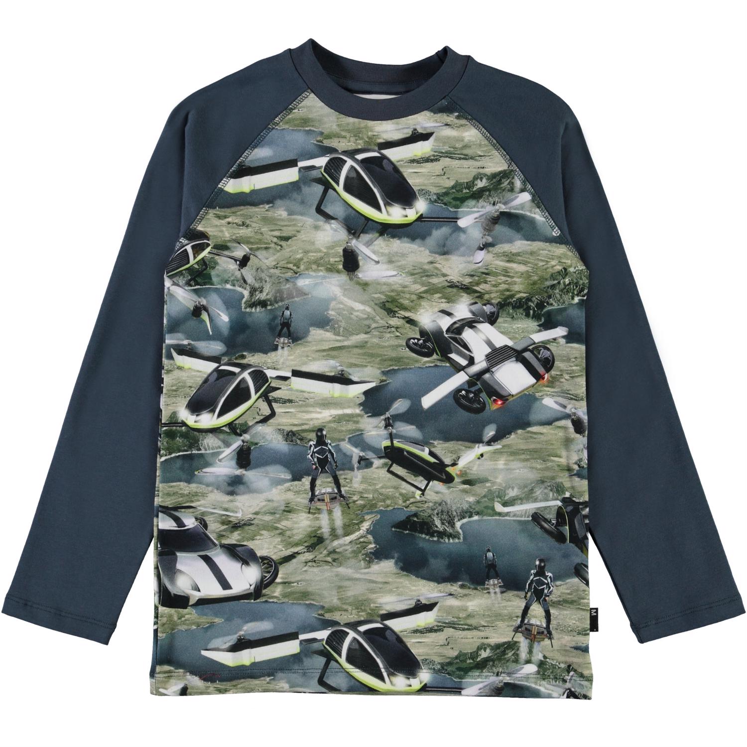 Remington ist ein blauer Raglan-Pullover mit langen Ärmeln. Hier ist der Pullover mit Druck von fliegenden Autos der Zukunft. Ecocert Greenlife, certifikationsnr. 197496.