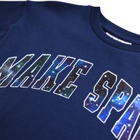 Dunkelblaues T-Shirt aus Öko-Baumwolle mit kurzen Ärmeln und einem runden, gerippten Ausschnitt. Das T-Shirt hat eine übergroße Passform und einen Frontdruck mit dem Text "Make Space".