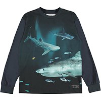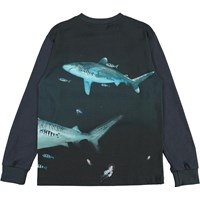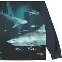Rexton ist ein blauer Langarmpullover mit einem Haifischdruck.