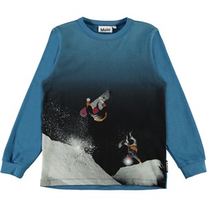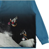 Rez ist ein blauer Langarmpullover mit Prints von coolen Snowboardern.