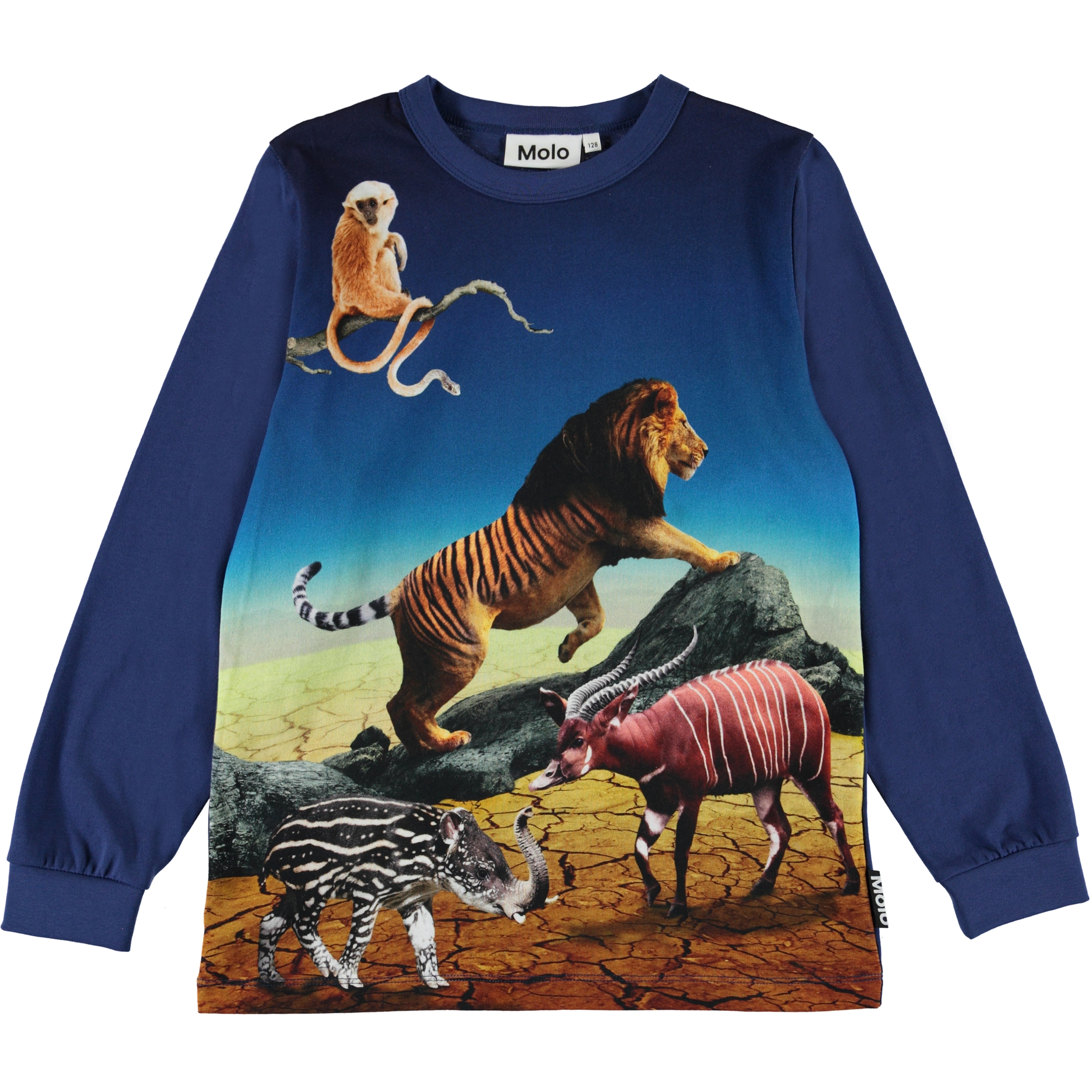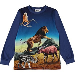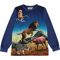 Auf der blauen Bluse Rez sind wir in die Zukunft gereist, wo die Tiere nicht mehr ganz wie sie selbst aussehen. Die Bluse hat eine Rippkante am Ende der Ärmel.