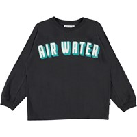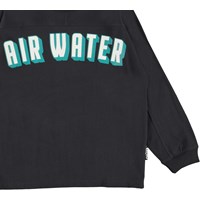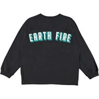 Rhon ist ein schwarzer Langarmpullover mit Textdruck der vier Elemente. Auf der Vorderseite steht der Text 'Air Water' und auf der Rückseite 'Earth Fire'.