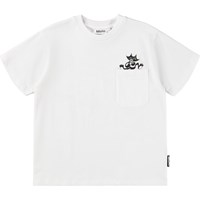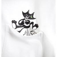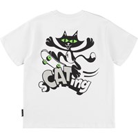 Weißes T-Shirt aus weicher Öko-Baumwolle mit kurzen Ärmeln und einem gerippten Ausschnitt. Das T-Shirt hat eine lockere Passform mit einem Rückendruck einer Katze auf einem Skateboard und dem Text ''sCATing'', sowie einem kleinen Druck einer furzenden Katze in der vorderen Tasche.