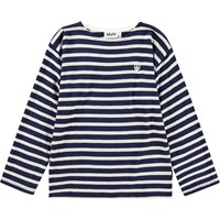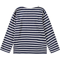 Dunkelblaue und weiße gestreifte Langarmbluse aus Öko-Baumwolle mit einem coolen und maritimen Look. Die Bluse hat eine kleine weiße Friedensstickerei auf der Vorderseite und eine normale Passform.
