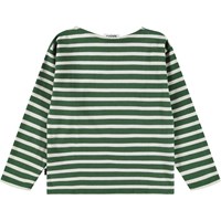 Bretonisches gestreiftes grün-weißes Langarmshirt aus weicher Öko-Baumwolle mit langen Ärmeln und internem Band am Ausschnitt. Das Langarmshirt hat eine lockere Passform mit einem kleinen gestickten Friedenszeichen auf der Brust.