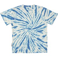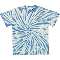 Riley ist ein T-Shirt mit einem blau-weißen Batikdruck, der eine schöne Spirale bildet.