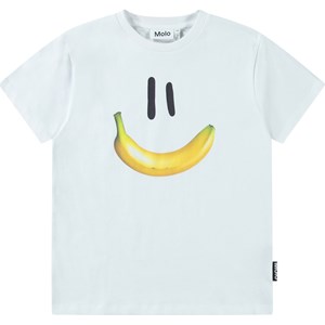 Weißes T-Shirt aus weicher Öko-Baumwolle mit kurzen Ärmeln und geripptem Ausschnitt. Das T-Shirt hat eine lockere Passform und einen Frontdruck eines lächelnden Gesichts mit einem Bananenmund.