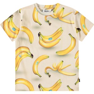 Beiges T-Shirt aus weicher Öko-Baumwolle mit kurzen Ärmeln und geripptem Ausschnitt. Das T-Shirt hat eine lockere Passform und ein Allover-Print mit gelben Bananen.