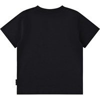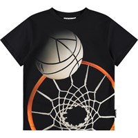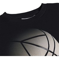 Schwarzes T-Shirt aus weicher Öko-Baumwolle mit kurzen Ärmeln und geripptem Halsausschnitt. Das T-Shirt hat eine lockere Passform mit einem Basketball-Print.