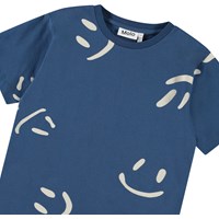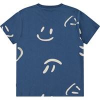 Blaues T-Shirt aus weicher Öko-Baumwolle mit kurzen Ärmeln und geripptem Ausschnitt. Das T-Shirt hat eine lockere Passform und ein Allover-Print aus weiß-grinsenden Gesichtern.