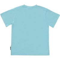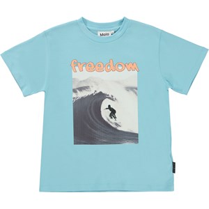 Riley ist ein blaues T-Shirt aus Öko-Baumwolle mit einem Aufdruck eines Surfers, der auf einer Welle reitet.