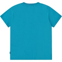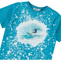 Blaues T-Shirt aus weicher Öko-Baumwolle mit kurzen Ärmeln und geripptem Ausschnitt. Das T-Shirt hat eine lockere Passform mit einem weißen Spritzer-Frontdruck und einem Surfer auf der Welle.