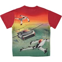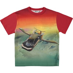 Riley ist ein rotes T-Shirt mit dem Aufdruck eines fliegenden Autos, und auf der Rückseite sind sowohl das Auto als auch ein Raumschiff zu sehen.