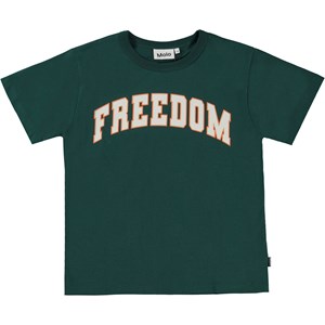 Dunkelgrünes T-Shirt mit grafischem Retro-Frontprint. Der Druck sagt "Freedom" und verbreitet die Botschaft des Friedens. Dieses T-Shirt ist aus 100% Öko-Baumwolle, hat kurze Ärmel, einen Rundhalsausschnitt mit gerippten Bündchen und eine lockere Passform.