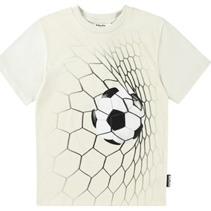 Weißes T-Shirt aus Öko-Baumwolle mit kurzen Ärmeln, Rundhalsausschnitt und geripptem Besatz am Hals. Das T-Shirt hat eine lockere Passform und einen positionierten Druck auf der Vorderseite. Der Druck auf dem T-Shirt zeigt einen Fußball im Moment, in dem er ins Netz zoomt und du ein Tor erzielst!