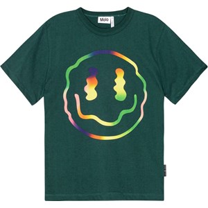 Grünes T-Shirt aus Öko-Baumwolle mit kurzen Ärmeln, Rundhalsausschnitt und geripptem Abschluss am Hals. Das T-Shirt hat eine lockere Passform und einen mehrfarbigen Druck auf der Vorderseite eines lächelnden Gesichts, leicht geknittert an den Rändern.