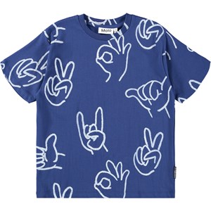 Blaues T-Shirt aus weicher Öko-Baumwolle mit kurzen Ärmeln und geripptem Ausschnitt. Das T-Shirt hat eine lockere Passform mit einem weißen Aufdruck von handgezeichneten Handzeichen.