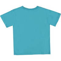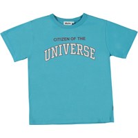 Blaues T-Shirt mit grafischem Retro-Front-Print. Der Aufdruck lautet „Citizen of the Univeres“ und umfasst die Botschaft, dass wir alle im selben Universum leben. Dieses T-Shirt ist aus 100% Öko-Baumwolle, hat kurze Ärmel, einen Rundhalsausschnitt mit gerippten Bündchen und eine lockere Passform.