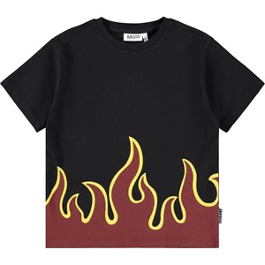 Schwarzes T-Shirt aus weicher Öko-Baumwolle mit kurzen Ärmeln und einem gerippten Ausschnitt. Das T-Shirt hat eine lockere Passform mit einem Flammenmuster in Burgunderrot und Gelb an der Taille.