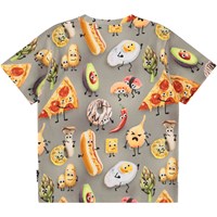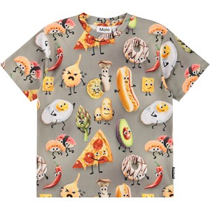 Khakifarbenes T-Shirt aus weicher Öko-Baumwolle mit kurzen Ärmeln und einem gerippten Ausschnitt. Das T-Shirt hat eine lockere Passform mit einem Druck von lebendigen bunten Lebensmitteln.